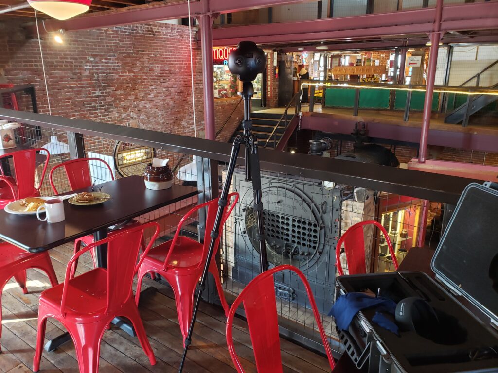 Setting up the Insta360 Pro at the Stoneware Cafe in Red Wing, Minnesota. The pie on the table was delicious.